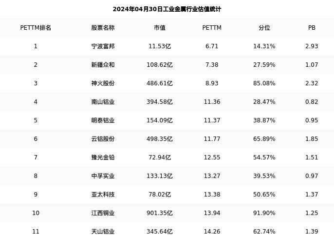 从估值角度看:天山铝业最新市盈率PETTM为14.26,在行业内排名11/59,处于62.74分位。