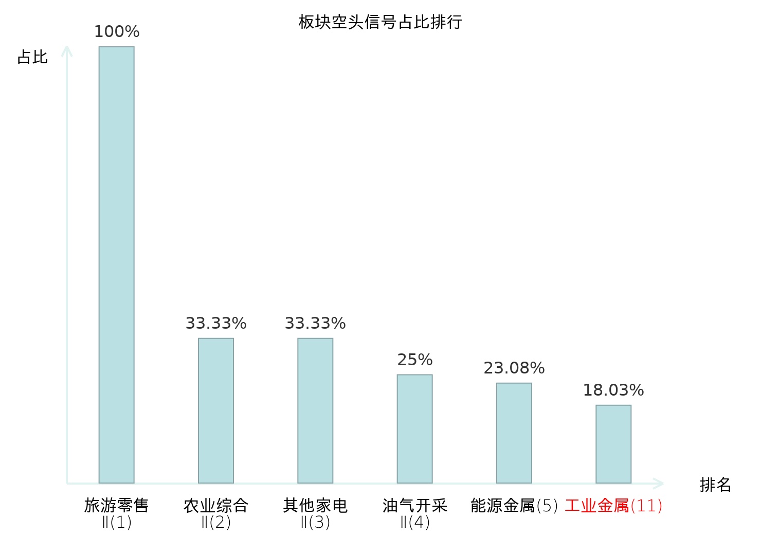 全市场所有行业板块中主力空头信号占比排名中,旅游零售Ⅱ板块位居第一。影视院线板块名次提升最快,较昨日上升105位。