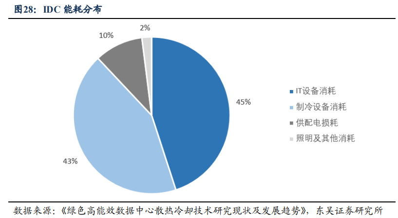散热是IDC发展的核心痛点。随着人工智能和大数据分析的兴起,IDC数据中心步入高速发展期,其不仅提供了强大的计算能力,还确保了数据的安全性和可靠性。然而,高算力也对IDC的散热效率提出了要求。《绿色高能效数据中心散热冷却技术研究现状及发展趋势》显示,在IDC数据中心的能耗分布中,IT设备占45%,用于散热的制冷设备占43%,二者几乎持平。由此可见,降低散热能耗是提高IDC工作效率、降低运营成本的核心解决方法。