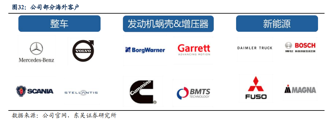 产品种类丰富,涡轮增压壳体、机械/电子水泵、排气歧管为主导产品。公司现有国内外主要客户超200家,同时服务全球超300个基地工厂。