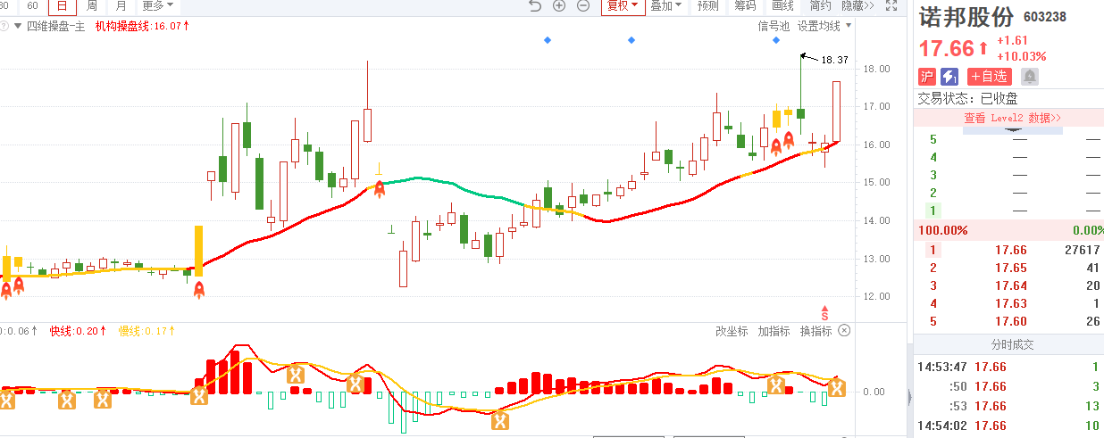 1)诺邦股份-四维操盘-近期出现火箭信号且底部量柱由绿转红