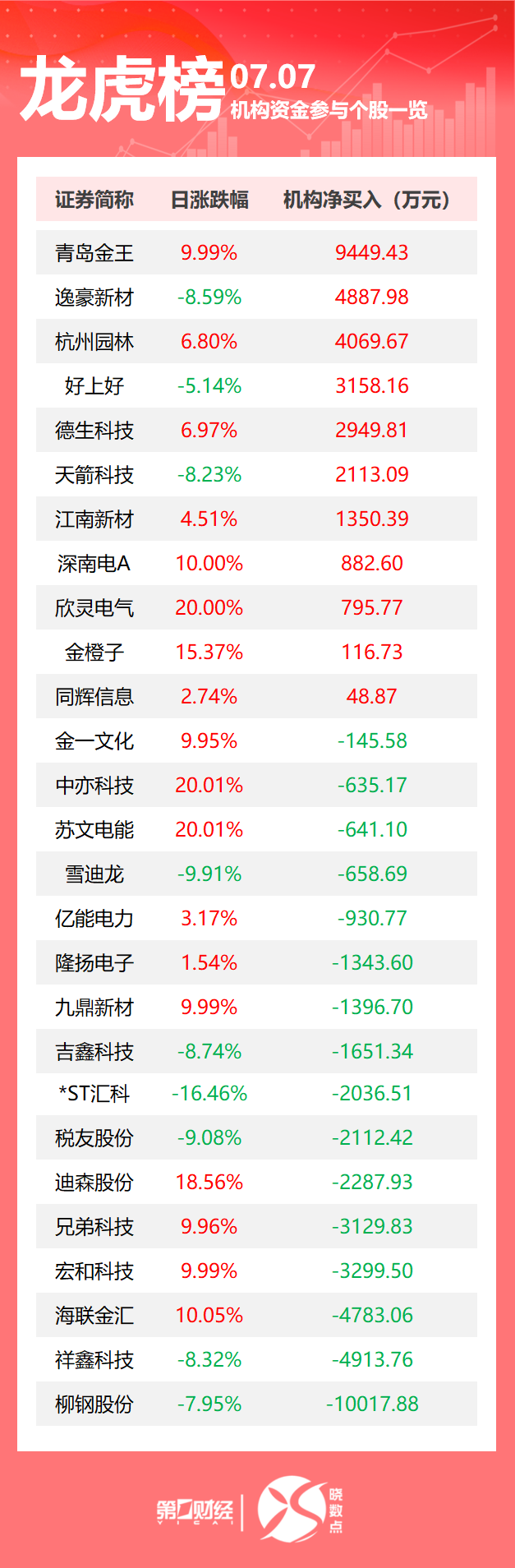 7月7日龙虎榜中,共27只个股出现了机构的身影,11只股票呈现机构净买入,16只股票呈现机构净卖出。当天机构净买入前三的股票分别是青岛金王、逸豪新材、杭州园林;当天机构净卖出前三的股票分别是柳钢股份、祥鑫科技、海联金汇。