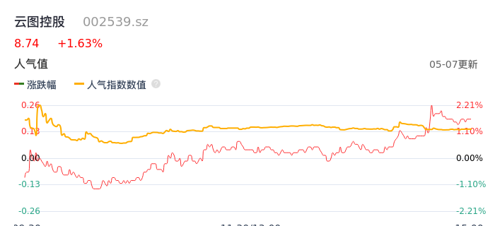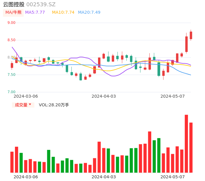 05月07日,云图控股收报8.74,股价涨幅1.63%,成交金额2.43亿元,换手率3.19%。