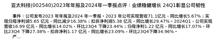 值得注意的是:2024年04月民生证券的邱祖学/袁浩分析师,首次发布关于亚太科技的研究报告,标题为:亚太科技(002540)2023年年报及2024年一季报点评:业绩稳健增长 24Q1彰显公司韧性。