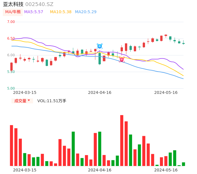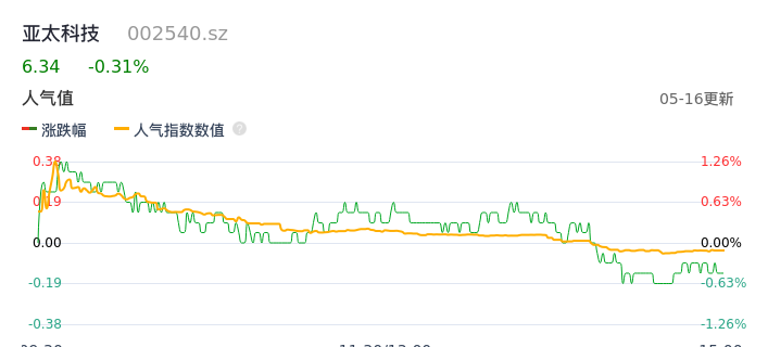 05月16日,亚太科技收报6.34,股价涨幅-0.31%,成交金额7339.72万元,换手率1.33%。