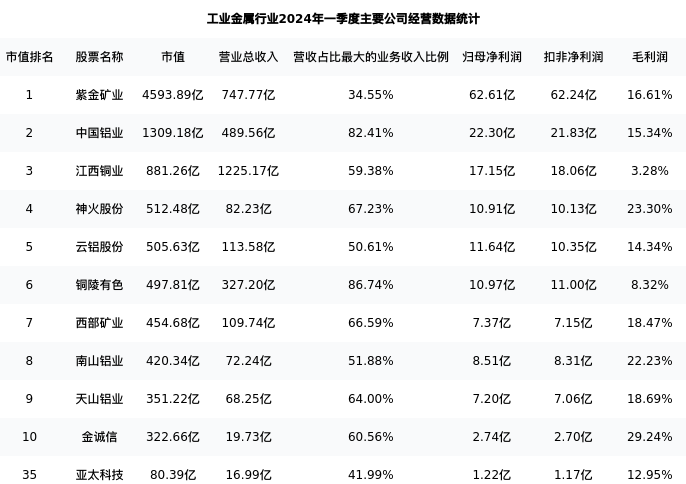 亚太科技最新报告期数据为一季度,下表汇总了工业金属行业内市值靠前的公司一季度主要经营数据