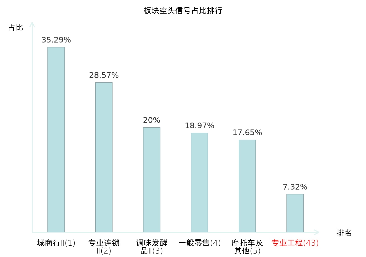 全市场所有行业板块中主力空头信号占比排名中,城商行Ⅱ板块位居第一。炼化及贸易板块名次提升最快,较昨日上升96位。