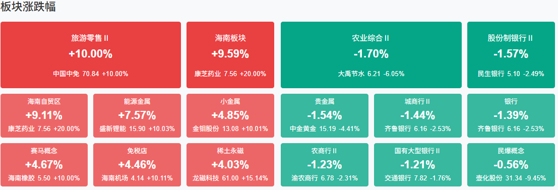 板块方面,海南自贸区、稀土永磁、锂矿、超级水电等板块涨幅居前,贵金属、银行、CPO等板块跌幅居前。截至收盘,沪指涨0.65%,深成指涨1.21%,创业板指涨1.5%。