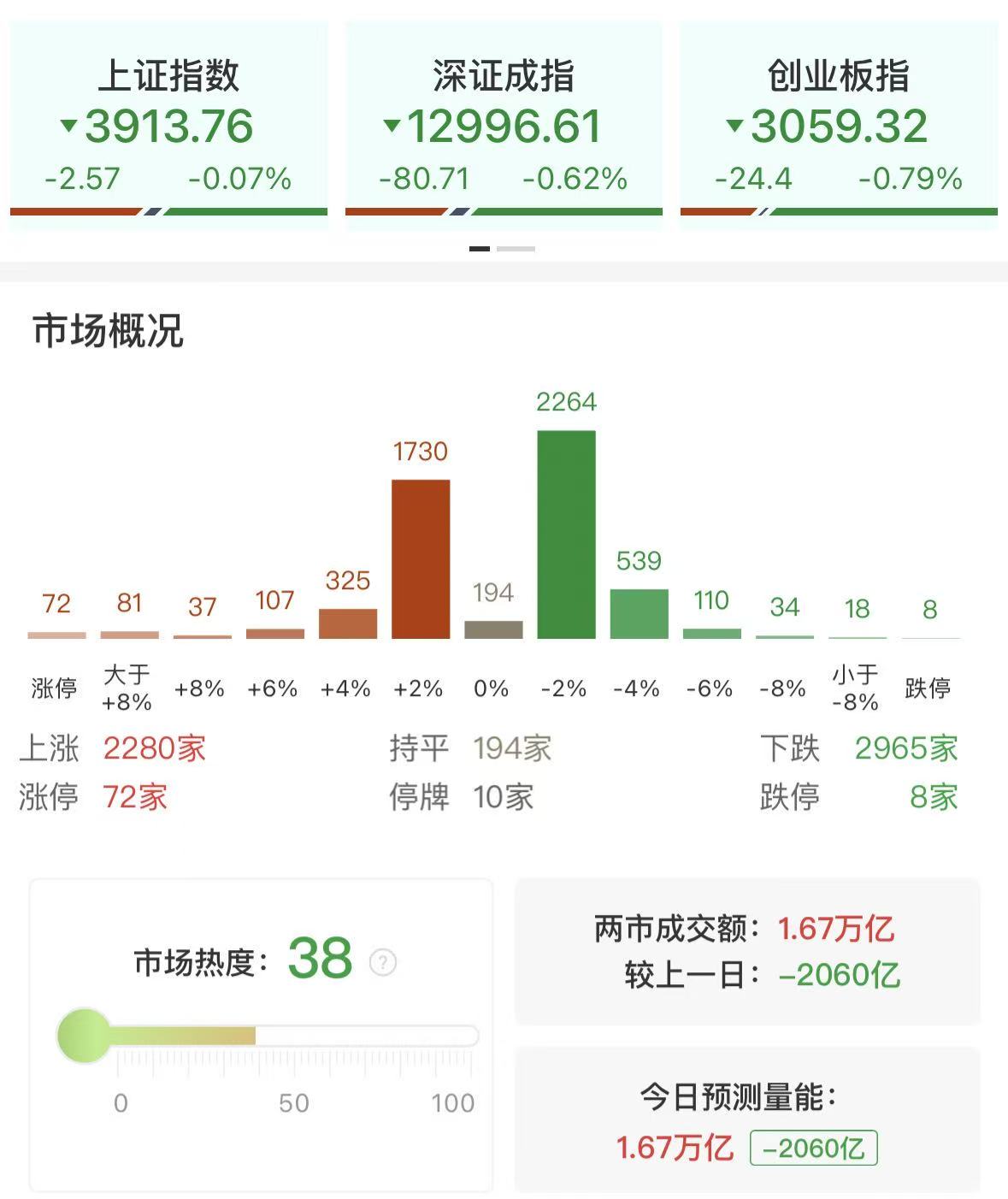 财联社10月22日讯,市场全天弱势震荡,三大指数盘中翻红后均出现回落。沪深两市成交额1.67万亿,量能进一步萎缩,较上一个交易日缩量2248亿,自8月5日以来首次跌破1.7万亿。盘面上,市场热点集中在深地经济、湖北国资等方向。其中深地经济概念股全天走强,神开股份、石化机械、中信重工三连板。湖北国资概念延续强势,武汉控股等多股晋级两连板。油气股午后爆发,贝肯能源涨停。银行板块逆势走强,农业银行续创历史新高。下跌方面,电池股集体走弱,天际股份、天赐材料等大跌。截至收盘,沪指跌0.07%,深成指跌0.62%,创业板指0.79%。