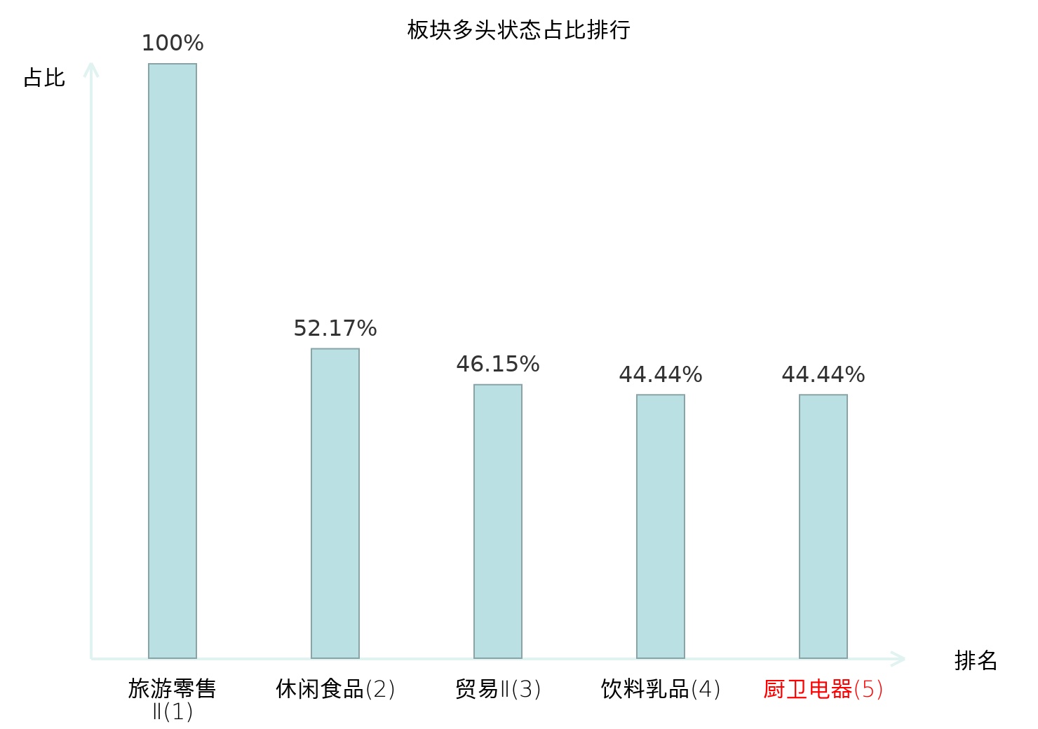 全市场所有行业板块中主力多头状态占比排名中,旅游零售Ⅱ板块位居第一。乘用车板块名次提升最快,较昨日上升91位。