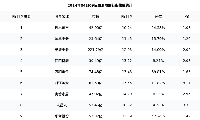 从估值角度看:万和电气最新市盈率PETTM为13.18,在行业内排名4/9,处于57.21分位。