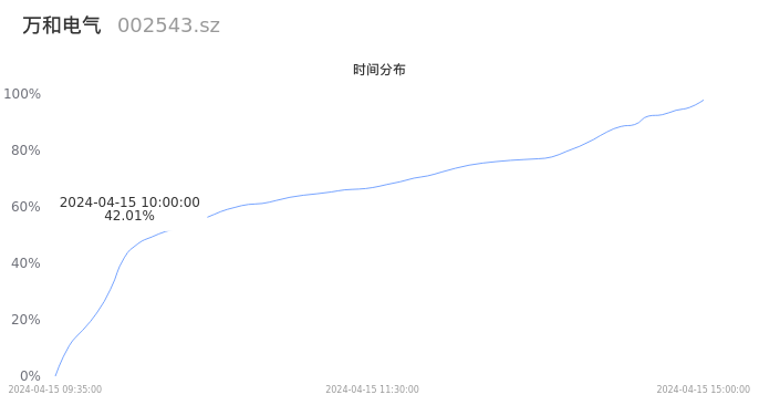 002543万和电气2024年04月15日成交10.21万手,成交金额1.07亿元,相较昨日缩量7361手,换手率1.54%,成交清淡。