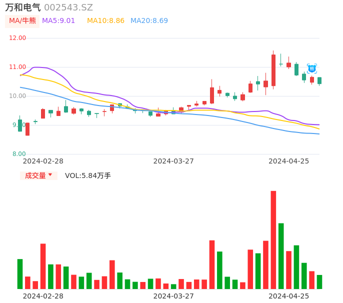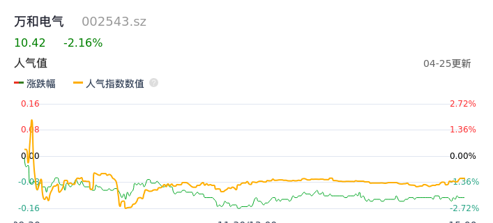 04月25日,万和电气收报10.42,股价涨幅-2.16%,成交金额6096.78万元,换手率0.88%。