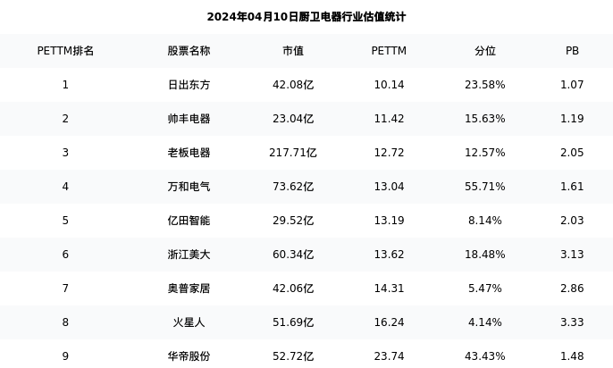 从估值角度看:万和电气最新市盈率PETTM为13.04,在行业内排名4/9,处于55.71分位。