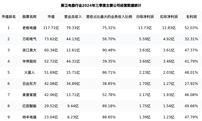 万和电气最新报告期数据为三季度,下表汇总了厨卫电器行业内市值靠前的公司三季度主要经营数据