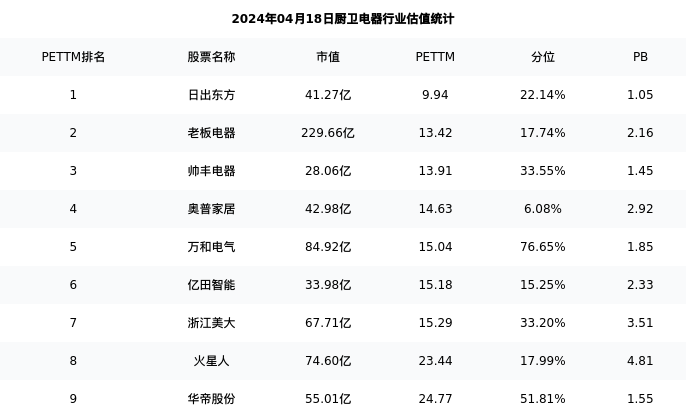 从估值角度看:万和电气最新市盈率PETTM为15.04,在行业内排名5/9,处于76.65分位。