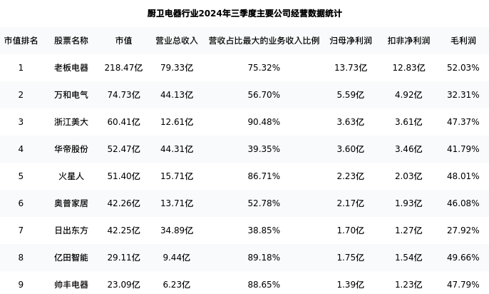 万和电气最新报告期数据为三季度,下表汇总了厨卫电器行业内市值靠前的公司三季度主要经营数据