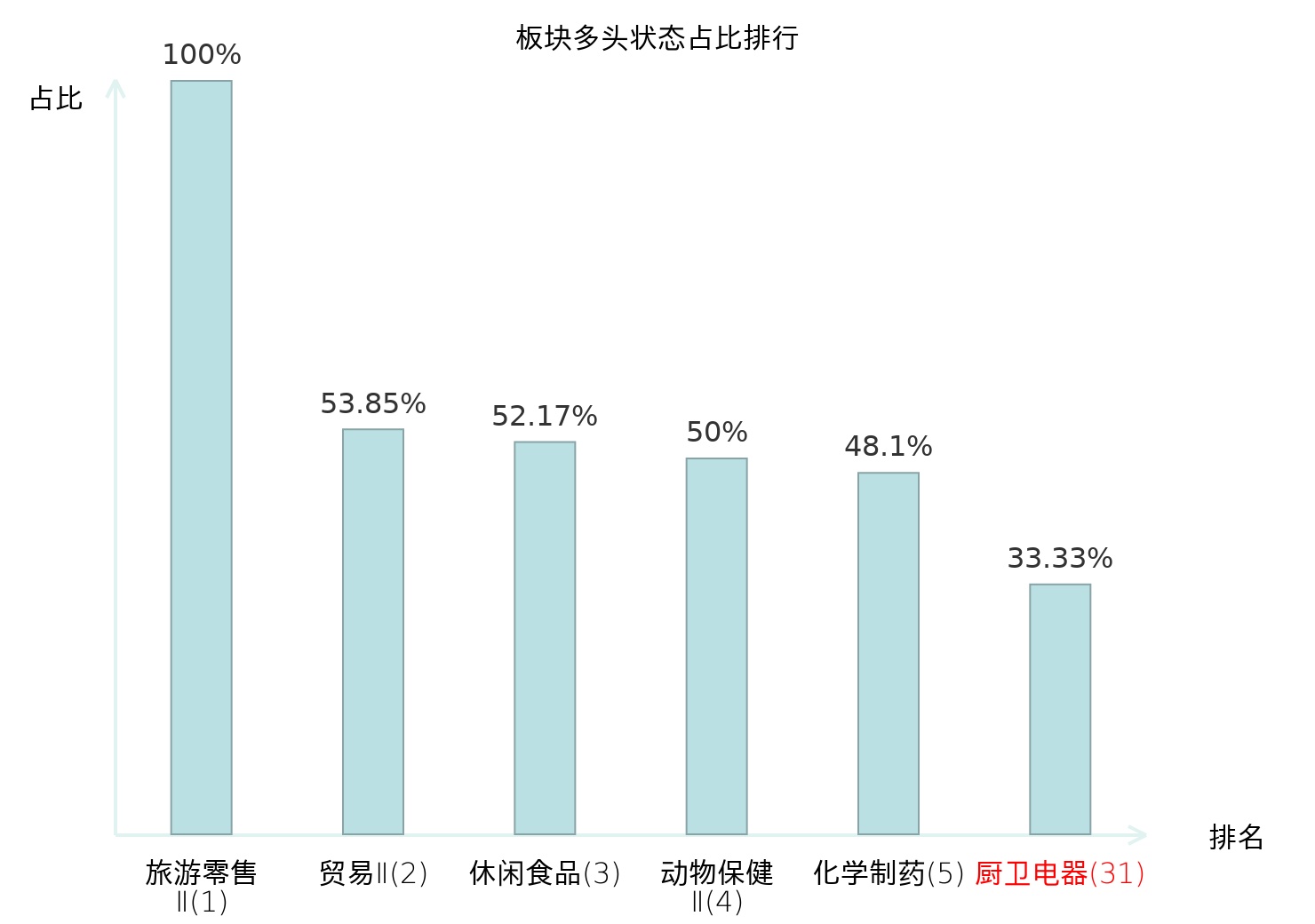 全市场所有行业板块中主力多头状态占比排名中,旅游零售Ⅱ板块位居第一。白酒Ⅱ板块名次提升最快,较昨日上升47位。