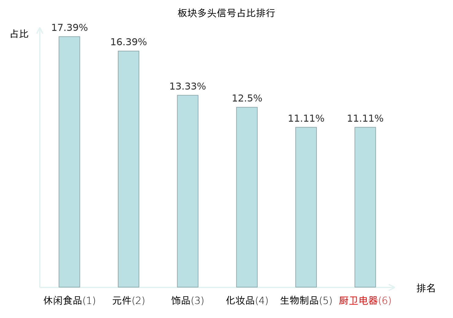全市场所有行业板块中主力多头信号占比排名中,休闲食品板块位居第一。厨卫电器板块名次提升最快,较昨日上升108位。
