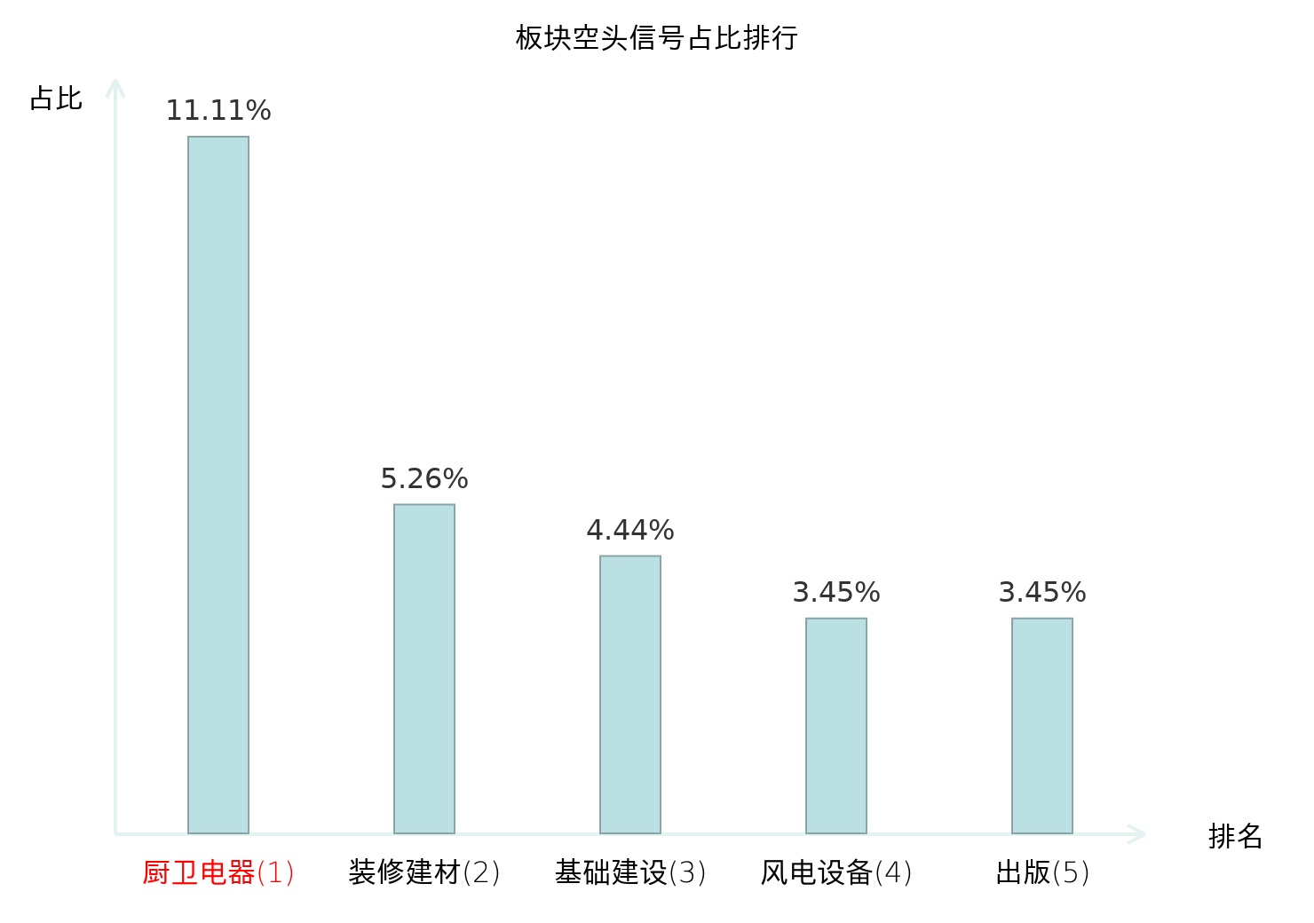 全市场所有行业板块中主力空头信号占比排名中,厨卫电器板块位居第一。塑料板块名次提升最快,较昨日上升121位。