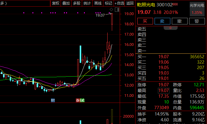 军工股早间集体走强,商业航天方向领涨,板块指数高开高走逼近历史最高点。乾照光电快速20%涨停,股价创历史新高(复权,下同),顺灏股份、通宇通讯等多股一字涨停,银河电子等盘中亦垂直封板。