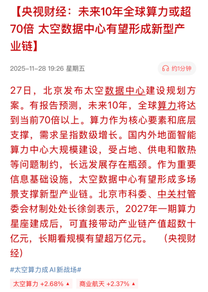1、11月27日,北京拟在700-800公里晨昏轨道建设运营超过千兆瓦(GW)功率的集中式大型数据中心系统,以实现将大规模AI算力搬上太空。此外,11月25日,国家航天局正式印发《国家航天局推进商业航天高质量安全发展行动计划(2025—2027年)》,为未来三年的发展提供了清晰的行动指南。