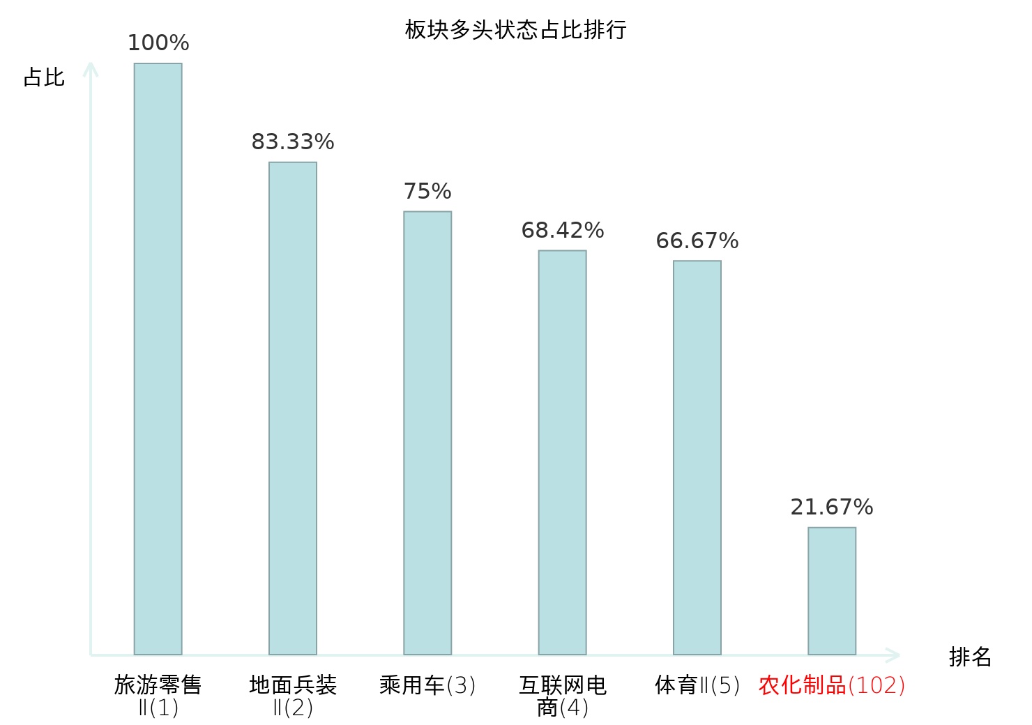 全市场所有行业板块中主力多头状态占比排名中,旅游零售Ⅱ板块位居第一。房屋建设Ⅱ板块名次提升最快,较昨日上升50位。