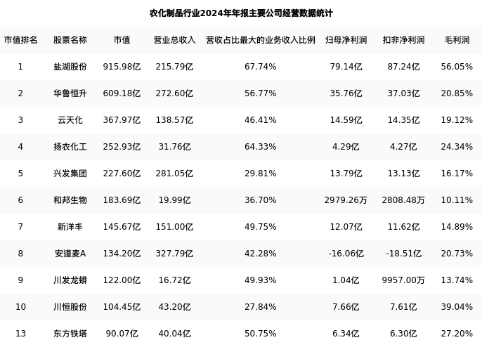东方铁塔最新报告期数据为年报,下表汇总了农化制品行业内市值靠前的公司年报主要经营数据