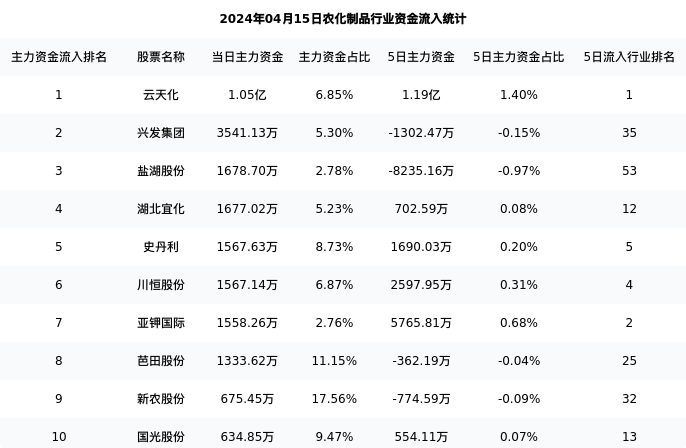 从主力资金流向来看,农化制品行业今日主力资金流入30.74亿元,在所有申万二级行业中排名:19/131。