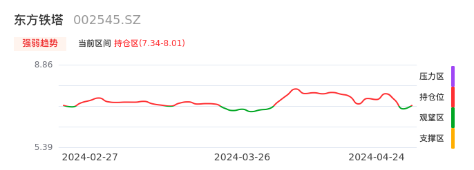 我们来看一下该股的九方特色指标强弱趋势的情况:东方铁塔近日从观望区上穿到持仓区。股价短期站稳多头区域,上升动能仍较为充足,可积极关注。后续重点关注上方压力位:8.01元是否能突破上攻。
