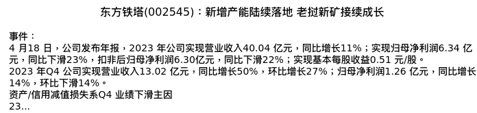 值得注意的是:2024年04月国联证券的柴沁虎分析师,首次发布关于东方铁塔的研究报告,标题为:东方铁塔(002545):新增产能陆续落地 老挝新矿接续成长。