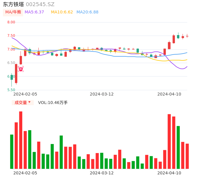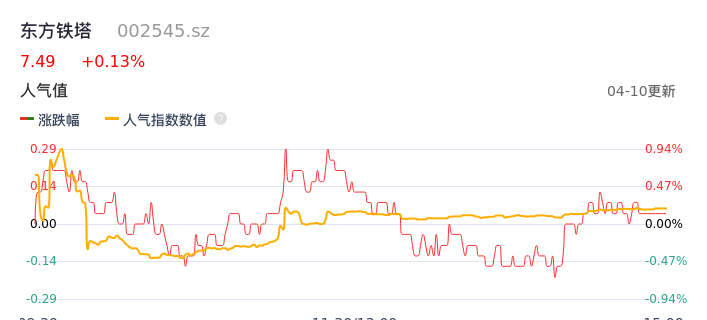 04月10日,东方铁塔收报7.49,股价涨幅0.13%,成交金额7839.37万元,换手率0.93%。