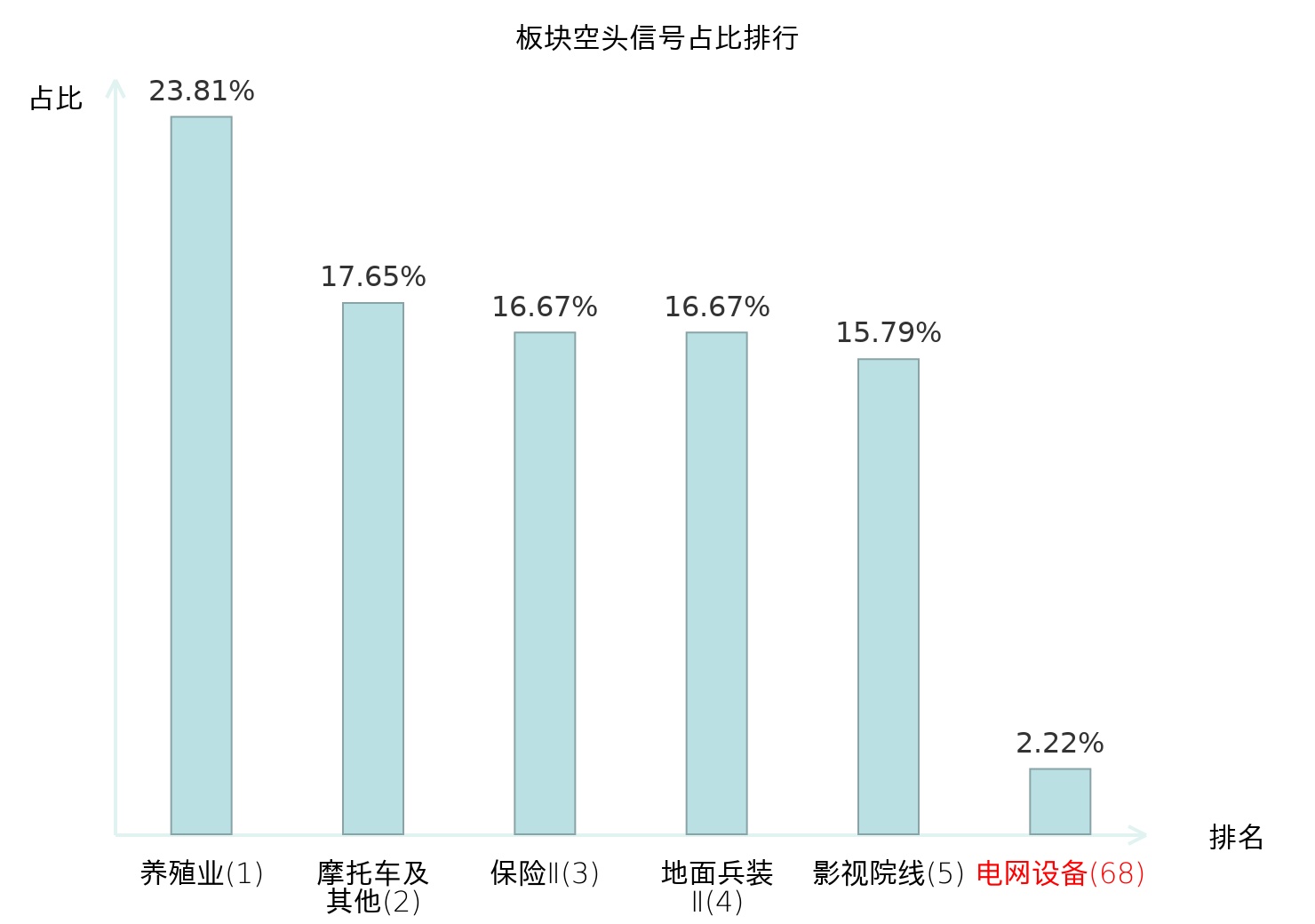 全市场所有行业板块中主力空头信号占比排名中,养殖业板块位居第一。养殖业板块名次提升最快,较昨日上升114位。