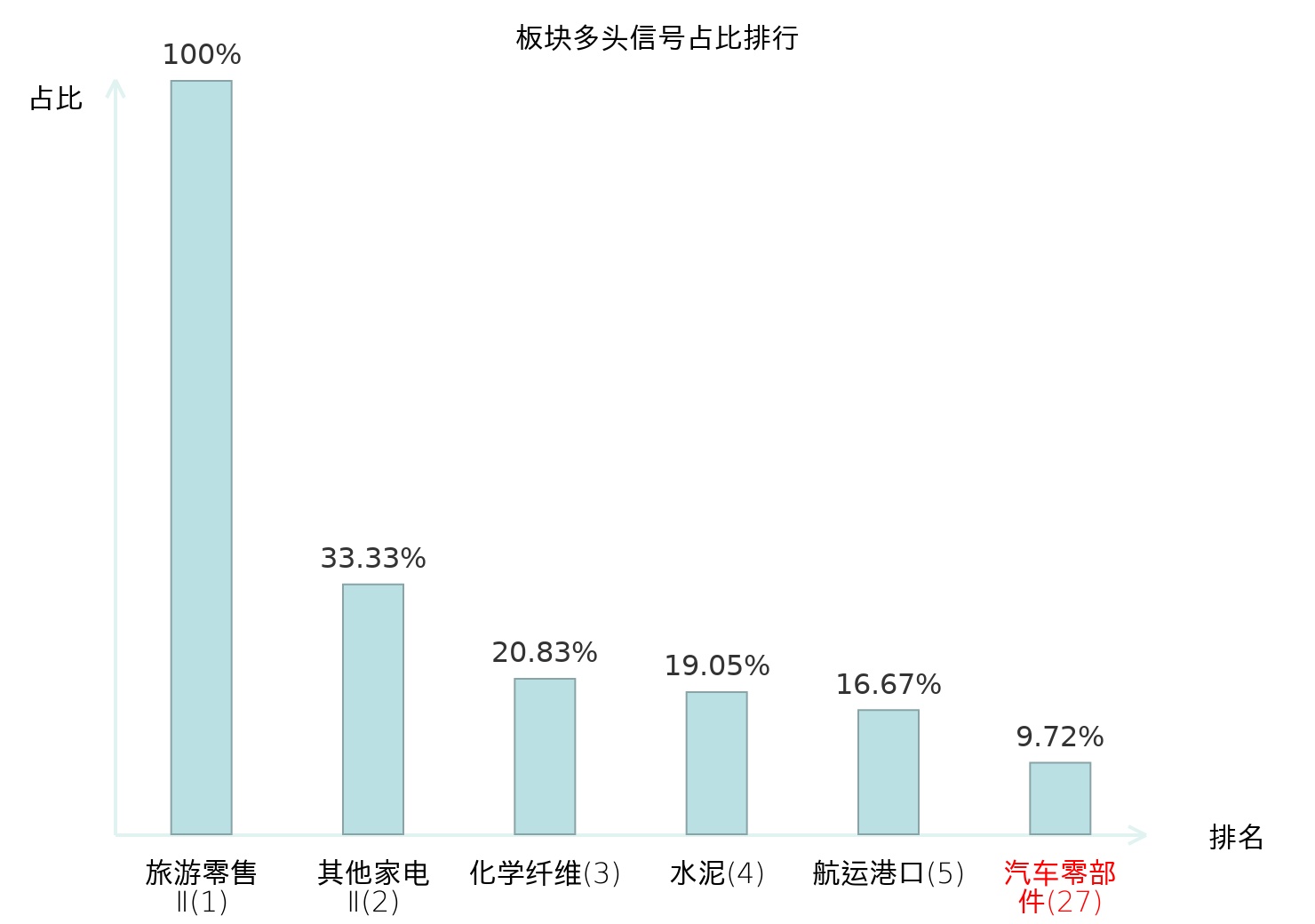 全市场所有行业板块中主力多头信号占比排名中,旅游零售Ⅱ板块位居第一。旅游零售Ⅱ板块名次提升最快,较昨日上升130位。