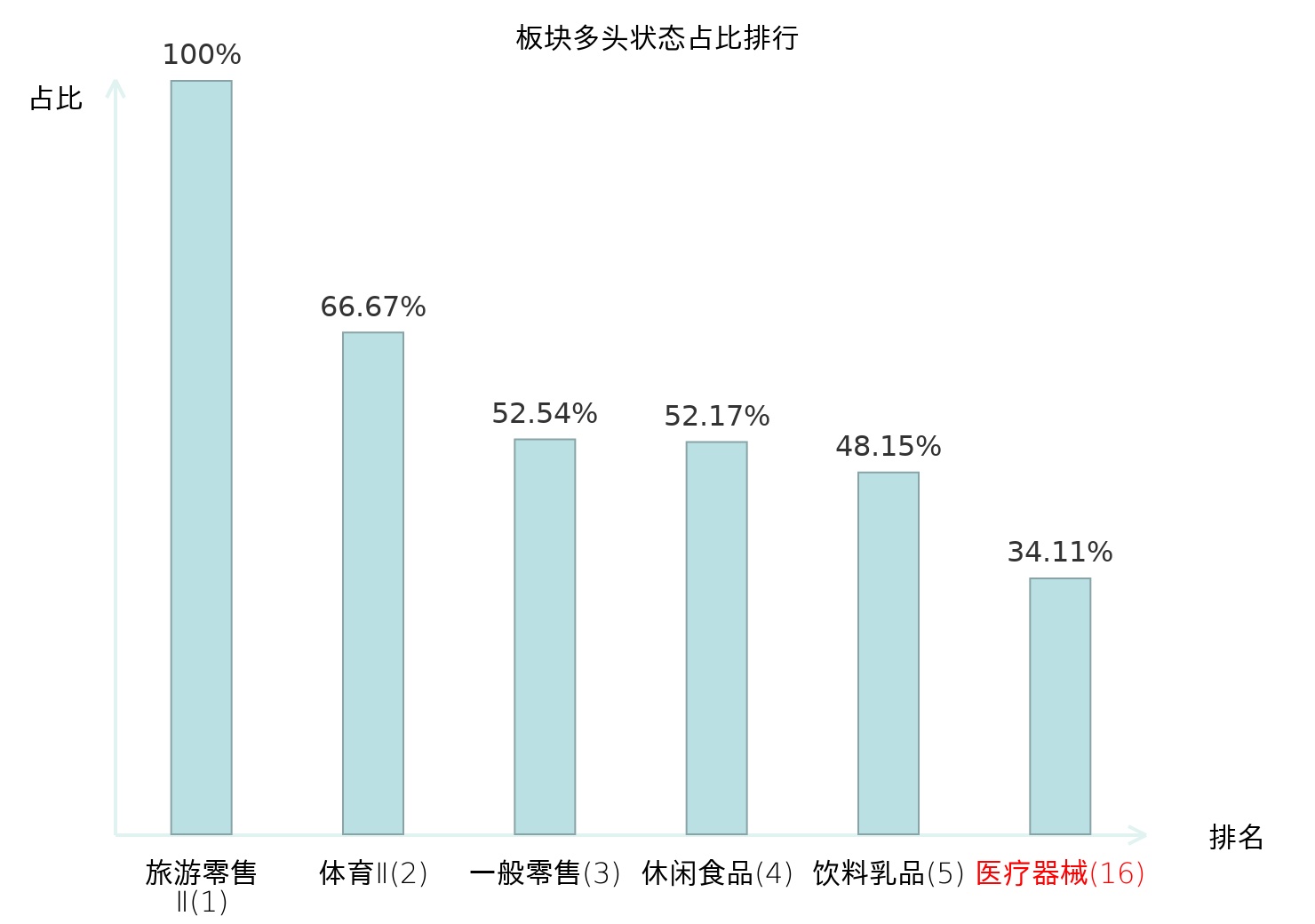 全市场所有行业板块中主力多头状态占比排名中,旅游零售Ⅱ板块位居第一。农业综合Ⅱ板块名次提升最快,较昨日上升109位。