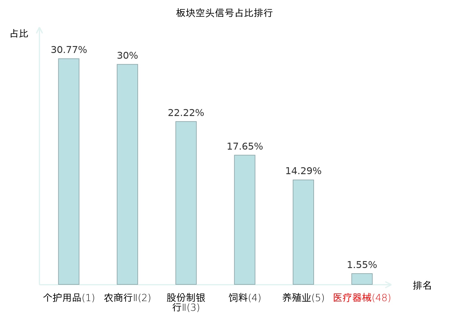 全市场所有行业板块中主力空头信号占比排名中,个护用品板块位居第一。个护用品板块名次提升最快,较昨日上升103位。