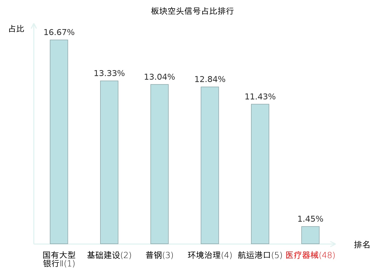 全市场所有行业板块中主力空头信号占比排名中,国有大型银行Ⅱ板块位居第一。环境治理板块名次提升最快,较昨日上升123位。