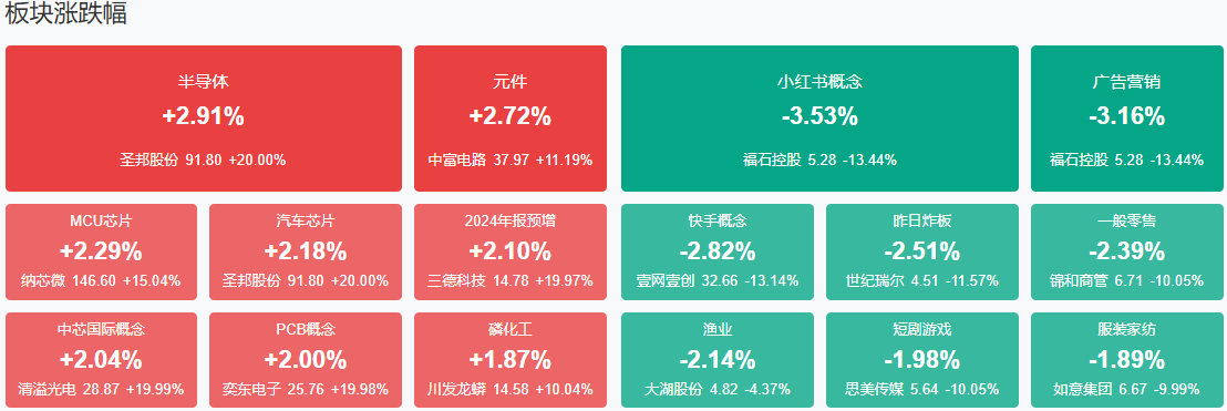 板块方面,半导体、PCB、磷化工、电子烟等板块涨幅居前,小红书概念、零售、文化传媒、免税等板块跌幅居前。