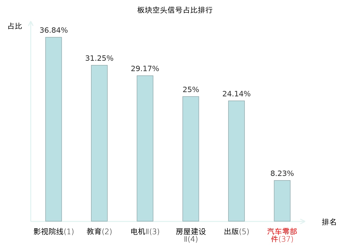 全市场所有行业板块中主力空头信号占比排名中,影视院线板块位居第一。出版板块名次提升最快,较昨日上升119位。