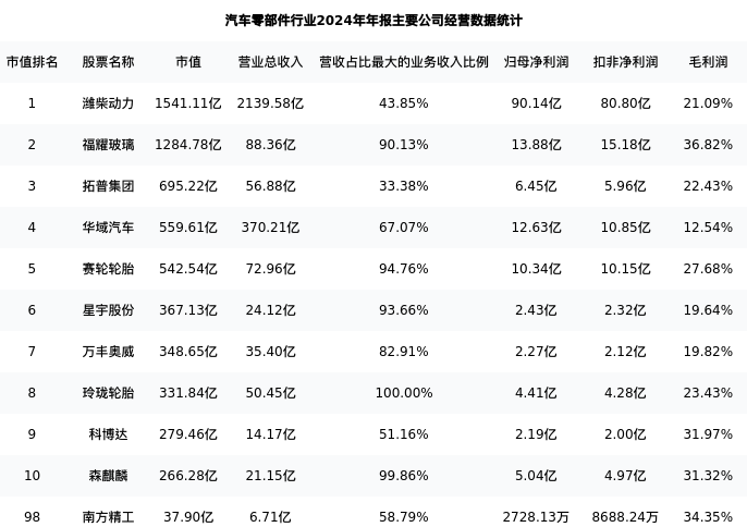 南方精工最新报告期数据为年报,下表汇总了汽车零部件行业内市值靠前的公司年报主要经营数据