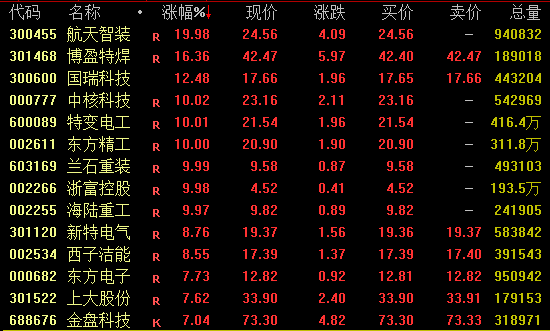 核电概念盘中大幅走高,截至收盘,航天智装20%涨停,国瑞科技涨超12%,中核科技、东方精工、兰石重装、浙富控股、海陆重工等均涨停。