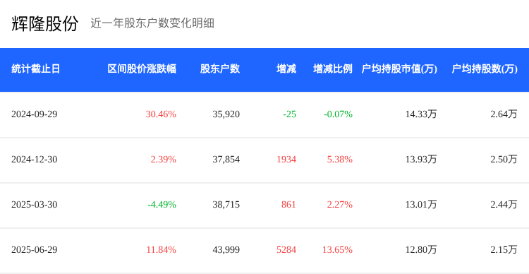 截至2025年6月30日,辉隆股份(002556)的股东户数增至4.40万户,较上期环比增长13.65%。与此同时,户均持股数量减少12.01%,户均持股市值降至12.80万元,环比下降1.59%。这表明,在报告期内,更多投资者加入持股行列,但人均持股数有所减少,可能导致持股集中度下降。