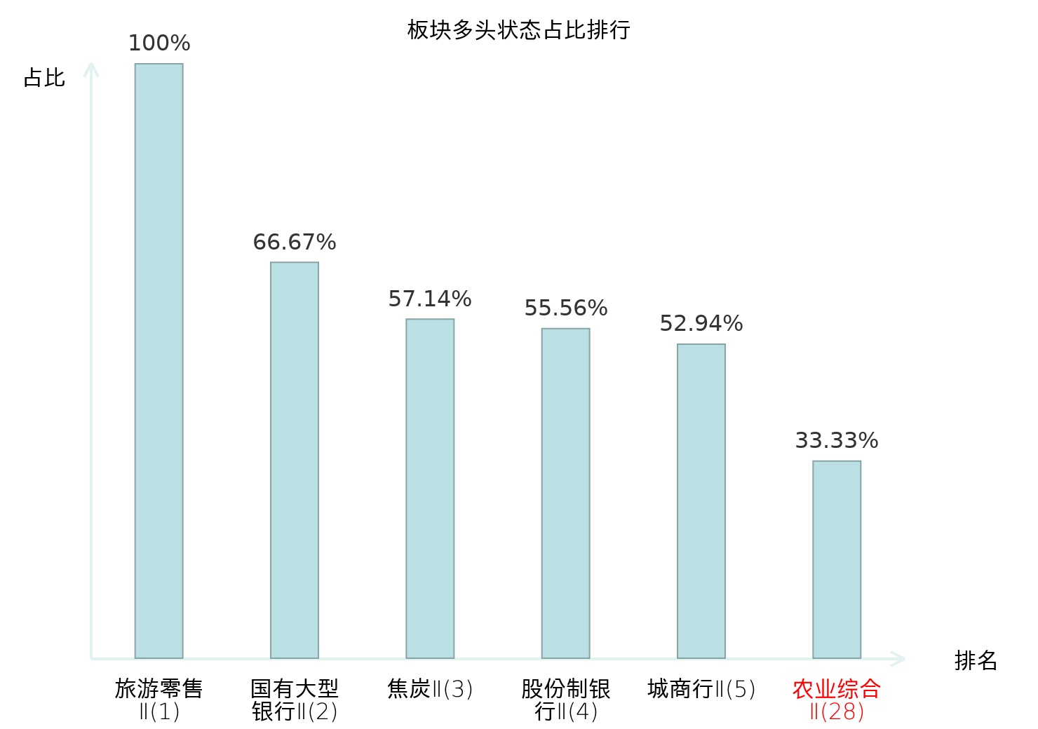 全市场所有行业板块中主力多头状态占比排名中,旅游零售Ⅱ板块位居第一。其他家电Ⅱ板块名次提升最快,较昨日上升101位。