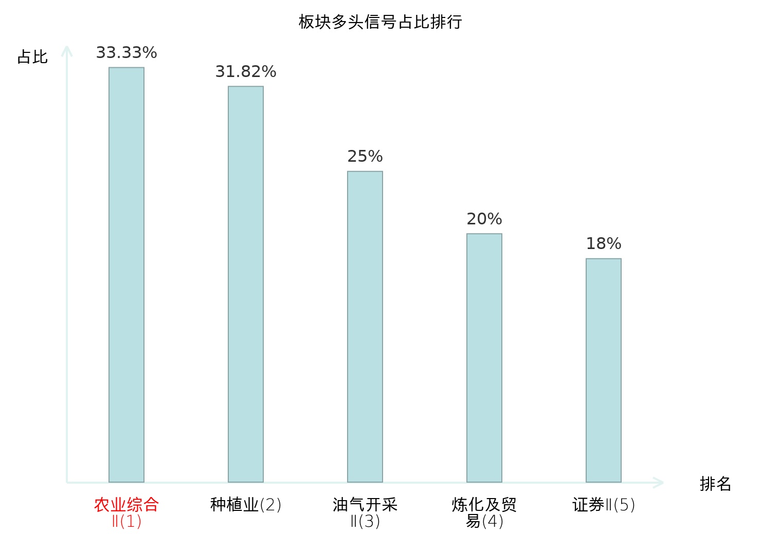全市场所有行业板块中主力多头信号占比排名中,农业综合Ⅱ板块位居第一。农业综合Ⅱ板块名次提升最快,较昨日上升127位。