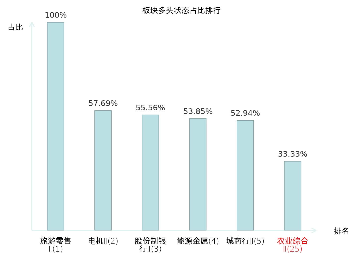 全市场所有行业板块中主力多头状态占比排名中,旅游零售Ⅱ板块位居第一。地面兵装Ⅱ板块名次提升最快,较昨日上升99位。