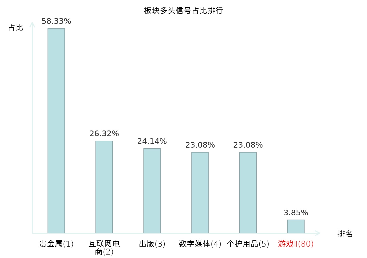 全市场所有行业板块中主力多头信号占比排名中,贵金属板块位居第一。贵金属板块名次提升最快,较昨日上升108位。