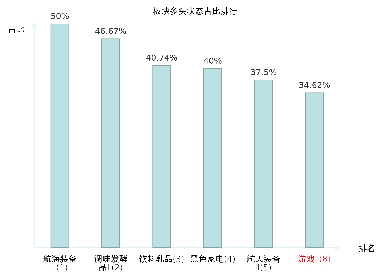 全市场所有行业板块中主力多头状态占比排名中,航海装备Ⅱ板块位居第一。航海装备Ⅱ板块名次提升最快,较昨日上升99位。