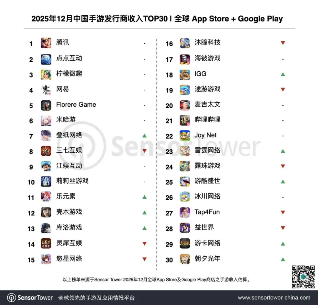 凭借12月初秦彻卡池“银翼安魂地”的推出和月末5.0版本二周年盛典的重磅上线,叠纸网络《恋与深空》再次问鼎全球手游畅销榜冠军,12月收入环比激增122%,创历史最高纪录。Sensor Tower 数据显示,截至12月底《恋与深空》全球收入达9.3亿美元,预计很快将突破10亿美元大关。该游戏的强劲表现带动叠纸网络本期收入激增90%,跻身收入榜第7名。