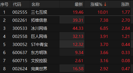 上证报中国证券网讯 8月26日早盘,游戏股表现活跃,截至9时36分,三七互娱涨停,拓维信息涨超7%,冰川网络涨逾6%,巨人网络、完美世界等跟涨。