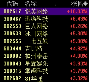 6月30日,游戏板块持续拉升,截至发稿,恺英网络涨停,迅游科技、巨人网络涨6%,冰川网络、三七互娱涨5%,掌趣科技、吉比特、星辉娱乐等跟涨。